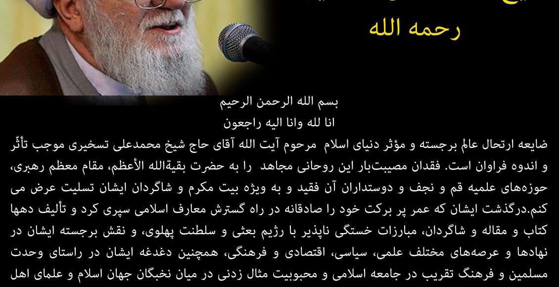 ضایعه ارتحال عالم برجسته و مؤثر دنیای اسلام مرحوم آیت الله آقای حاج شیخ محمدعلی تسخیری موجب تأثّر و اندوه فراوان است. فقدان مصیبتبار این روحانی مجاهد را به حضرت بقیهالله الأعظم، مقام معظم رهبری، حوزههای علمیه قم و نجف و دوستداران آن فقید و به ویژه بیت مکرم و شاگردان ایشان تسلیت عرض می کنم.درگذشت ایشان که عمر پر برکت خود را صادقانه در راه گسترش معارف اسلامی سپری کرد و تألیف دهها کتاب و مقاله و شاگردان، مبارزات خستگی ناپذیر با رژیم بعثی و سلطنت پهلوی، و نقش برجسته ایشان در نهادها و عرصههای مختلف علمی، سیاسی، اقتصادی و فرهنگی، همچنین دغدغه ایشان در راستای وحدت مسلمین و فرهنگ تقریب در جامعه اسلامی و محبوبیت مثال زدنی در میان نخبگان جهان اسلام و علمای اهل سنت، از جمله خدمات ایشان در راه و سیره اهل بیت علیهم السلام است. ایشان بی شک از مفاخر حوزههای علمیه و از ستارگان درخشان و پرفروغ آسمان وحدت اسلامی بودند که رحلتشان دلهای دغدغهمندان و دلسوزان وحدت اسلامی را محزون کرد.