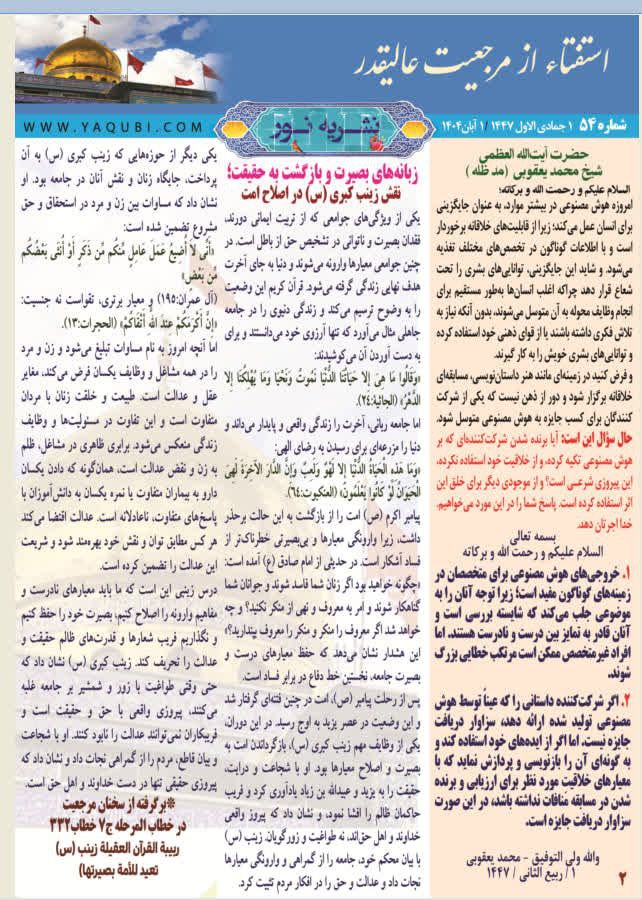 والصفحه الثانیه من هذه النشره تضمنت استفتاء موجّه الی المرجع الدینی الشیخ محمد الیعقوبی (دام ظله) حول استخدام الذکاء الاصطناعی ومدى مشروعیه إسناد بیاناته للمستخدم. کما وتضمنت الإشاره إلى سیره السیده زینب علیها السلام تحت عنوان (ربیبه القرآن العقیله زینب (س) تعید للأمه بصیرتها) فی کلام المرجعیه (دام ظلها) من خطاب المرحله ج۷ خطاب۳۳۲.