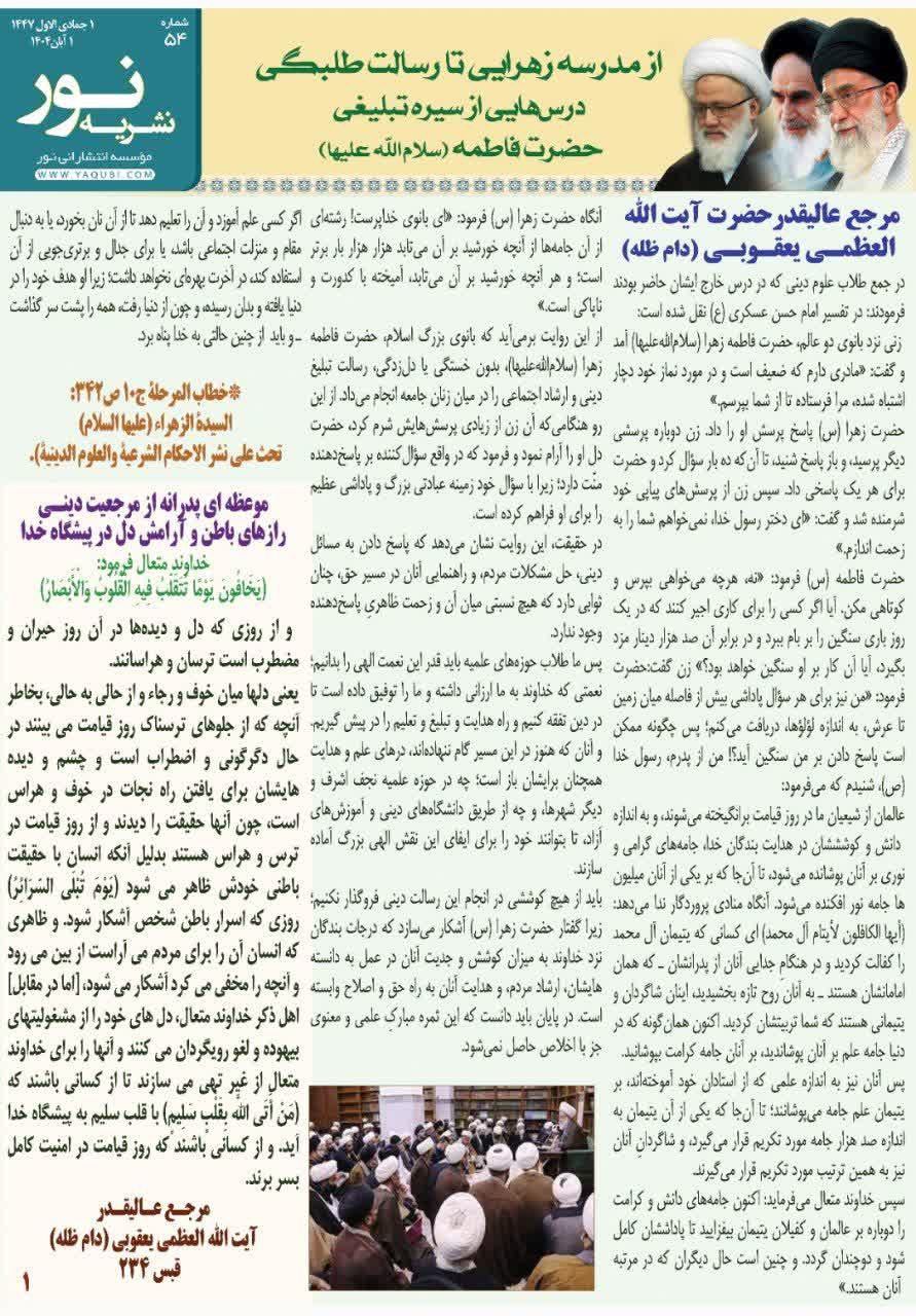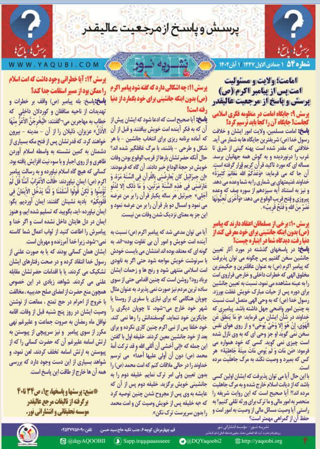مؤسسه نور للترجمه و التحقیق تحت إشراف مکتب سماحه المرجع الدینی ایه الله العظمى الشیخ محمد الیعقوبی (دام ظله) فی قم المقدسه، تم نشر العدد ۵۴ من نشره “نور” باللغه الفارسیه.