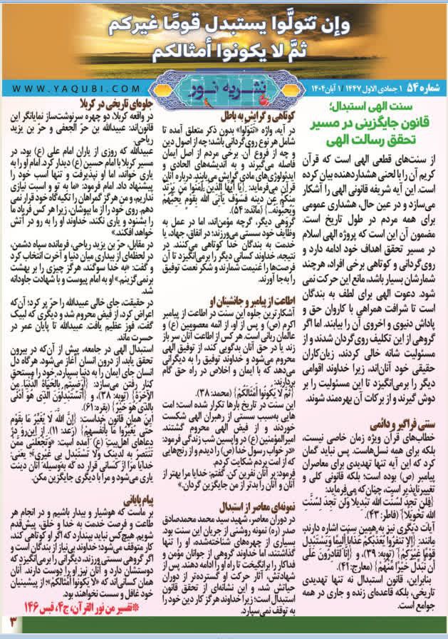 والصفحه الثالثه من هذه النشره تتناول السنه الإلهیه فی الاستبدال، أی قانون التبدیل فی طریق تحقیق الرساله الإلهیه، وذلک من شرح الآیه الکریمه: (وَإِن تَتَوَلَّوۡاْ یَسۡتَبۡدِلۡ قَوۡمًا غَیۡرَکُمۡ ثُمَّ لَا یَکُونُوٓاْ أَمۡثَٰلَکُم)، مقتبس من تفسیر من نور القرآن، المجلد الرابع، القبس ۱۴۶.