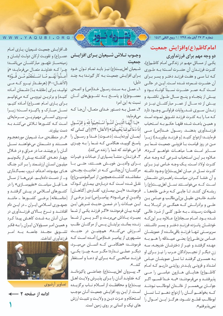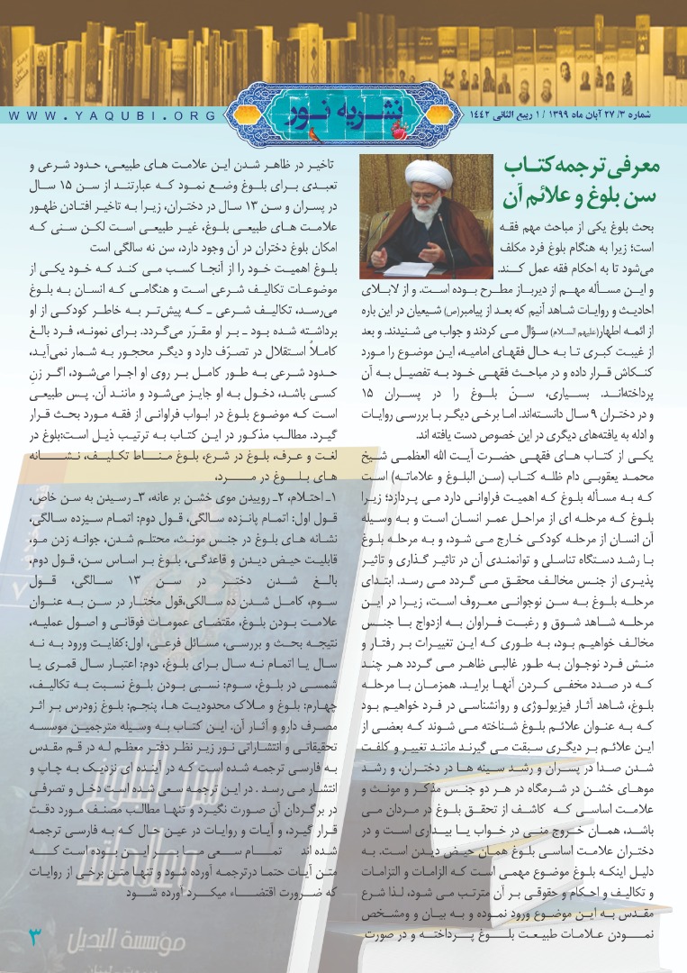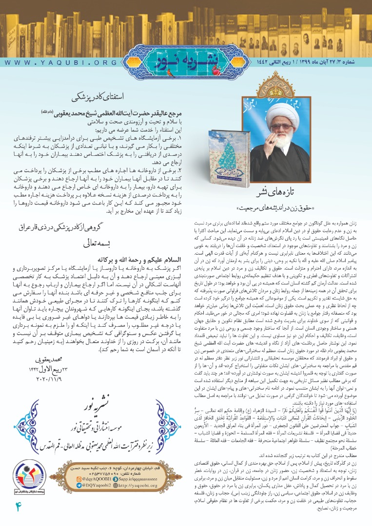 موسسه تحقیقاتی و انتشاراتی نور زیر نظر دفتر مرجع عالیقدر حضرت آیت الله العظمی شیخ محمد یعقوبی شماره ۳ نشریه نور را منتشر کرد.