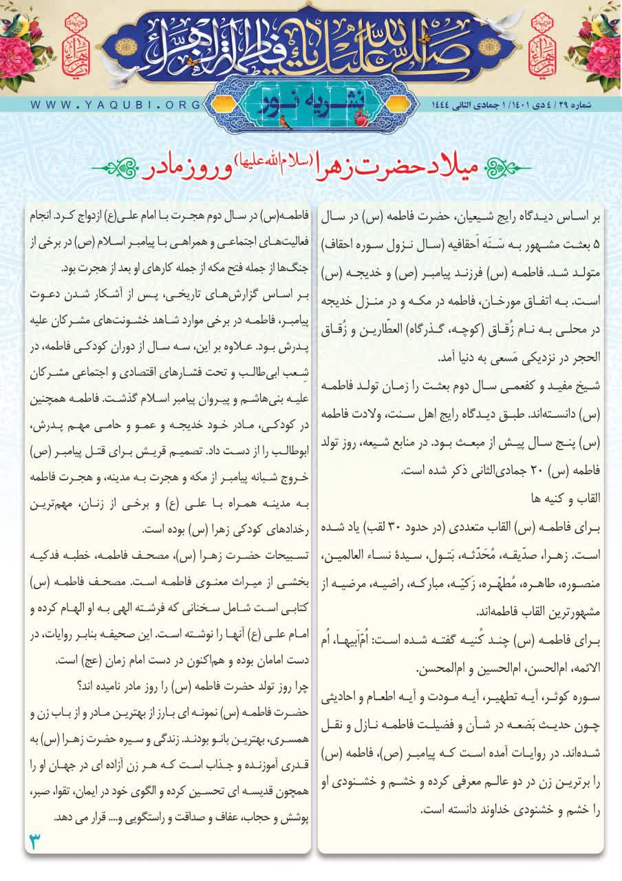 و درصفحه سوم این نشریه، اشاره مختصری از زندگانی حضرت فاطمه سلام الله علیها به مناسبت میلاد پر برکت ایشان و روز مادر با عنوان (میلاد حضرت زهرا (سلام الله علیها) و روز مادر) مورد توجه قرار گرفته است.