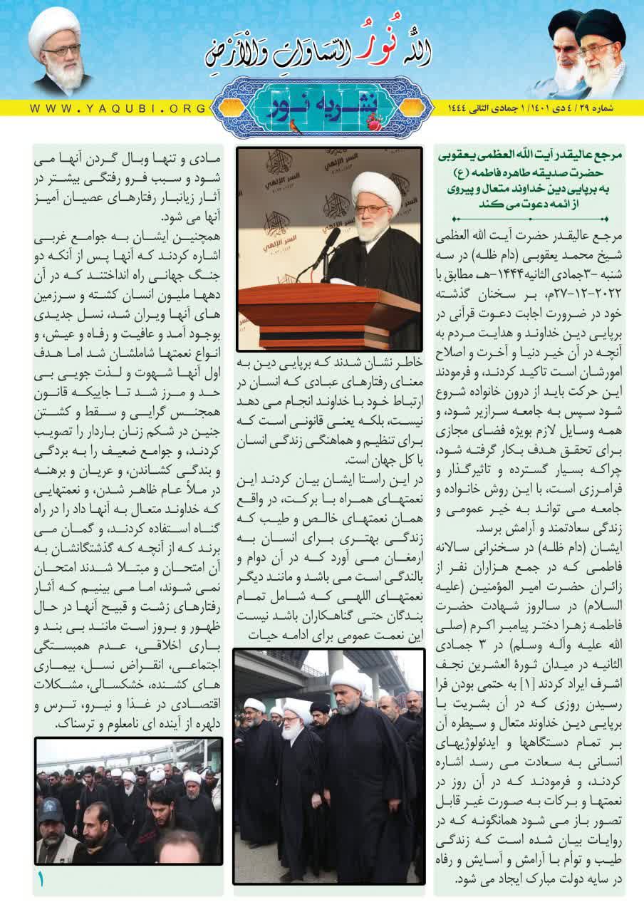 صفحه یک این شماره از نشریه حاوی سخنرانی است که مرجع عالیقدر حضرت آیت الله العظمی یعقوبی دام ظله در سوم جمادی الثانی ۱۴۴۴ هـ. در جمع عزاداران فاطمی در نجف اشرف با عنوان (حضرت صدیقه طاهره فاطمه (ع) به برپایی دین خداوند متعال و پیروی از ائمه دعوت می کند) ایراد شد.